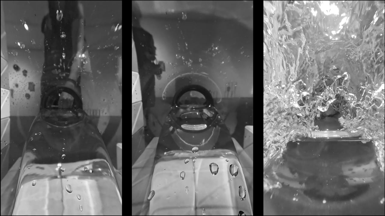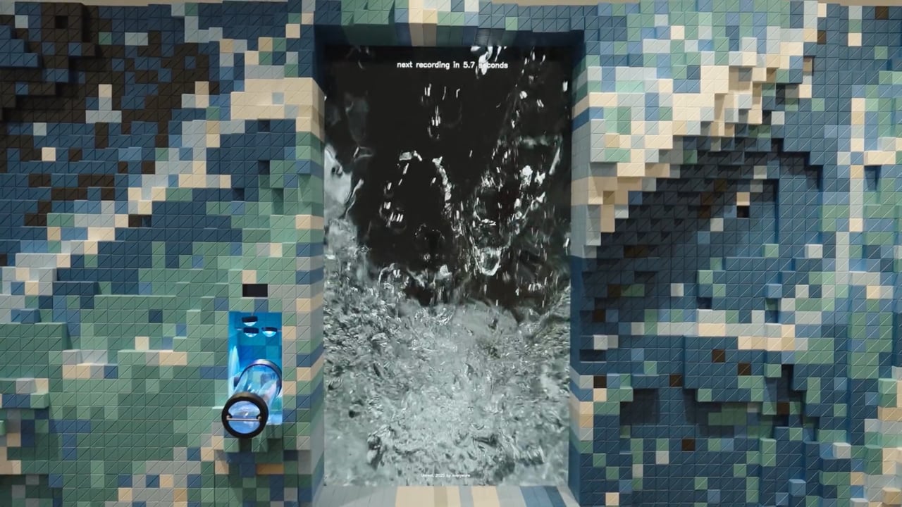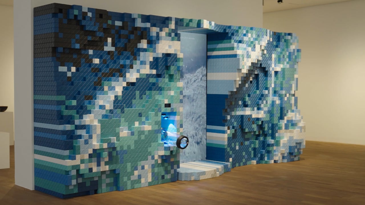 Waves in motion are a quintessential subject in computer graphics, often rendered even more hyperrealistically in simulations than in real footage. The work juxtaposes video of actual waves surging within a physical glass tank—appearing like a virtual simulation striving for realism—with the triangular tile fragments covering the exterior of the piece, which resemble the triangular mesh structure used in computer simulations. This contrast functions as a playful metaphor for the increasingly blurred boundary between reality and simulation.