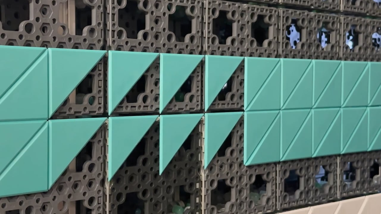 The work is constructed using TiLiT, a modular system composed of standardized structural units and interchangeable square tiles. Structure and surface are deliberately separated: the form is assembled first, and color and pattern are completed by attaching tiles afterward. From a distance, the repeated square units resolve into a single image; up close, their discrete nature becomes visible, recalling the visual language of pixels.